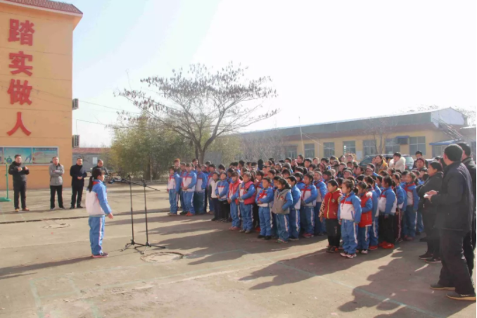 11時(shí)整,全校老師和同學(xué)們相聚在學(xué)校操場(chǎng),愛心捐贈(zèng)活動(dòng)正式開始,出席本次捐贈(zèng)活動(dòng)的有:九三學(xué)社的劉彥濤秘書長(zhǎng)、侯家華主委、泰安市化馬灣鎮(zhèn)教委彭主任與健源生物董事長(zhǎng)王誠(chéng)先生、總經(jīng)理助理兼辦公室主任王玲女士。學(xué)校張校長(zhǎng)對(duì)九三學(xué)社與山東健源生物科技有限公司的捐贈(zèng)表示感謝,感謝九三學(xué)社以及社會(huì)各界對(duì)學(xué)校教育的關(guān)注和支持,感謝在寒冬里送來(lái)溫暖和祝福。并告誡全校師生要懂得感恩,將這份愛心傳遞下去。