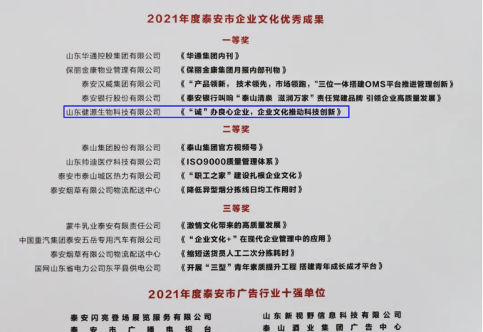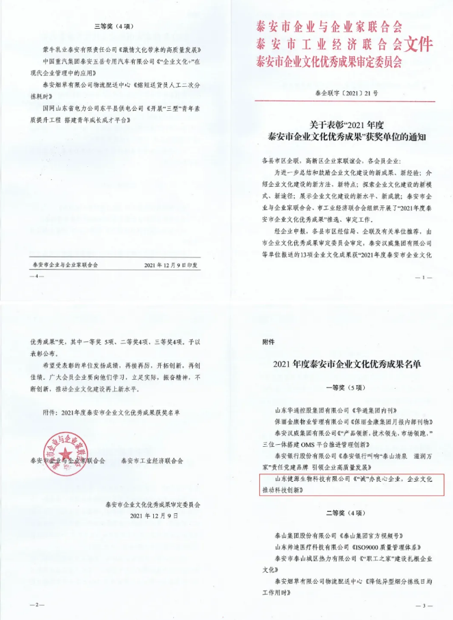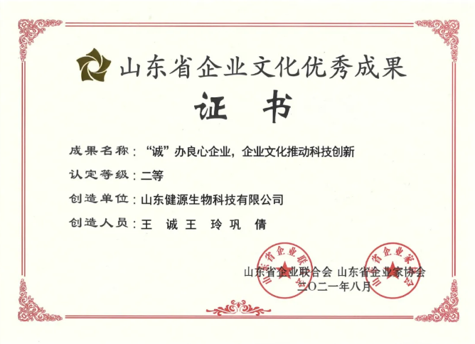 2021年8月,山東省企業聯合會、山東省企業家協會發布《關于公布首屆山東省企業文化優秀成果的通知》,山東健源生物科技有限公司報送的““誠”辦良心企業,企業文化推動科技創新”企業文化建設成果榮獲首屆山東省企業文化優秀成果二等獎。