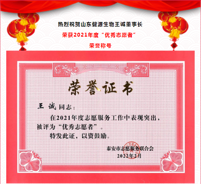 熱烈祝賀山東健源生物王誠(chéng)董事長(zhǎng)榮獲2021年度“志愿者”榮譽(yù)稱(chēng)號(hào)