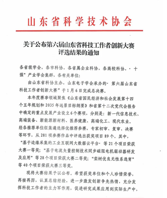 由山東省科協主辦,山東電子學會承辦的"第六屆山東省科技工作者創新大賽”1月6日完成總決賽。本年度賽事領域聚焦《山東省國民經濟和社會發展第十四個五年規劃和2035年遠景目標綱要》和省第十二次黨代會報告中確定的重點發展產業設立6個賽項,分別是:新一代信息技術、高端裝備、新能源新材料、醫養健康、高端化工、現代農業。經各推薦單位征集遴選擇優推薦參賽,專家初審、復審、決賽等環節,從281項參賽作品中評選出獲獎項目89個。其中,山東健源生物科技有限公司《飼草料高效優質青貯關鍵技術研發與產業化》項目榮獲第六屆科技工作者創新大賽二等獎。