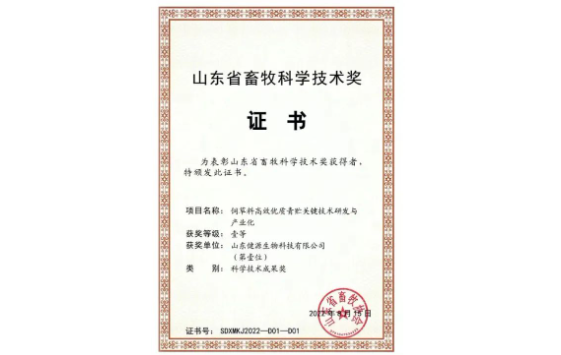 山東健源生物榮獲山東省畜牧科學技術獎一等獎