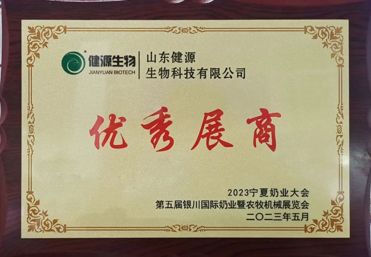 山東健源生物科技有限公司榮獲2023寧夏奶業大會/第五屆銀川國際奶業暨農牧機械展覽會“優秀展商”稱號。
