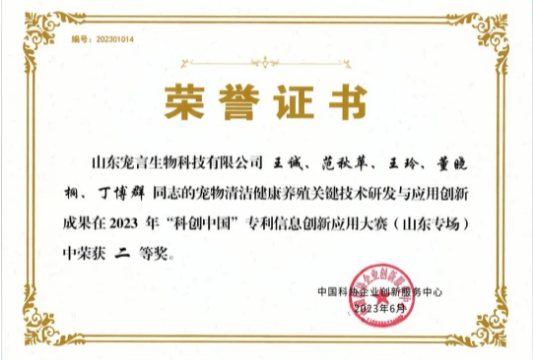 山東寵言生物科技有限公司《寵物清潔健康養殖關鍵技術研發與應用》項目榮獲2023年科創中國專利信息創新應用大賽(山東專場)二等獎