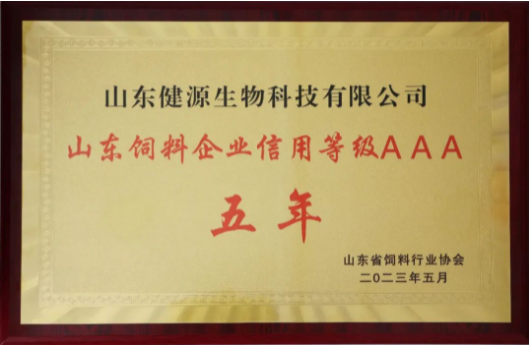 為不斷提高連續多年獲得《山東飼料企業信用等級AAA》的信用等級的含金量,山東省飼料行業協會將以每滿5年為時間段,頒發山東飼料企業信用等級AAA的榮譽證書和牌匾(2023年會上頒發)。山東健源生物科技有限公司榮獲《山東飼料企業信用等級AAA》五年企業榮譽稱號。