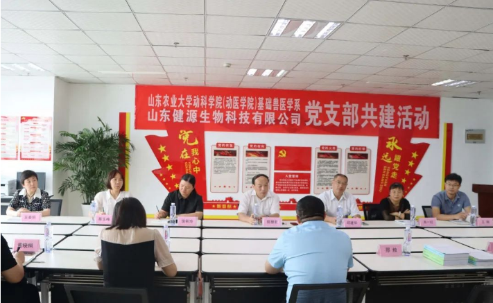 2023年8月26日, 山東農業大學動科學院(動醫學院)基礎獸醫學系與山東健源生物科技有限公司開展黨支部共建活動,山東農業大學郭慧君教授、邱建華副教授、侯秋玲教授、肖一紅教授、蔡玉梅教授、王剛教授、王春陽副教授,山東健源生物科技有限公司董事長王誠以及研發部相關負責人參加此次黨建共建活動。