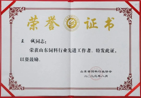 山東健源生物董事長王誠榮獲2023山東飼料行業(yè)先進工作者