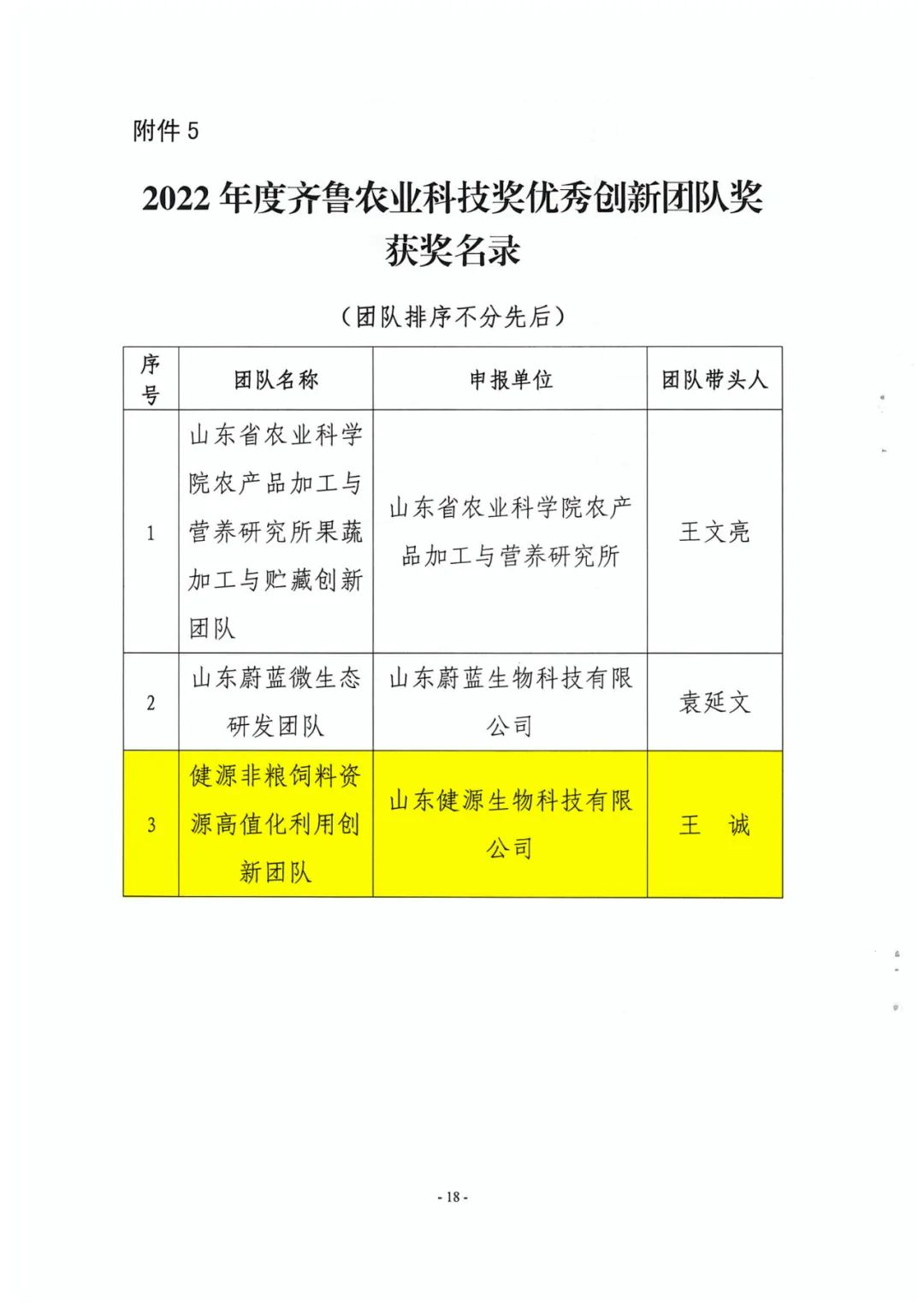 由山東健源生物有限公司董事長王誠作為團隊帶頭人,帶隊的“健源非糧飼料資源高值化利用創新團隊”榮獲2022年度齊魯農業科技獎優秀創新團隊獎。