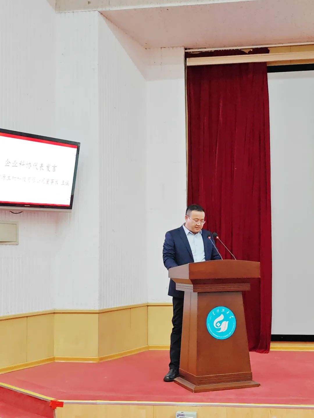 第二階段是泰安市校企科協聯盟成立大會,由市政府副秘書長李建蔚主持,先宣讀了泰安市行政審批局《關于同意召開泰安市校企科協聯盟成立大會》的批準書。接下來由企業科協代表和高校科協代表發言。山東健源生物科技有限公司董事長王誠代表企業科協上臺發言。