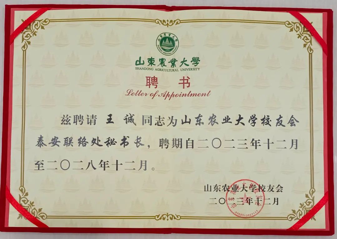 作為山東農業大學的一名校友,健源生物董事長王誠飲水不忘思源,積極參與到泰安聯絡處換屆工作中,擔任換屆工作籌備組秘書長,本著隆重熱烈、務實節儉的原則,經過明確分工、周密部署、精誠協作,被山東農業大學校友會聘請為山東農業大學校友會泰安聯絡處秘書長并授予“山東農業大學優秀校友工作者”榮譽稱號。