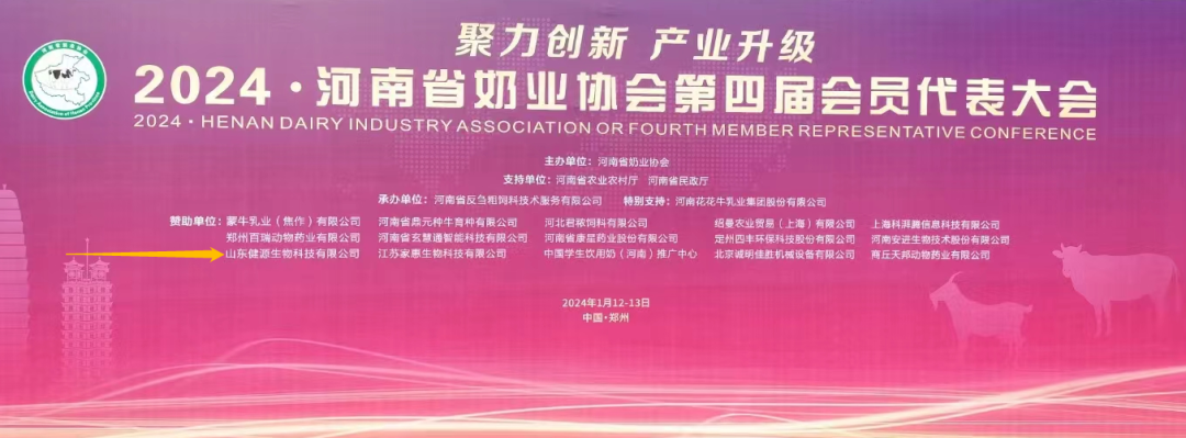 2024年1月12-13日,由河南省奶業協會主辦、河南省農業農村廳、河南省民政廳支持的2024河南奶業協會第四屆會員代表大會在鄭州舉行。農業農村部相關業務部門領導、河南省農業農村廳奶業管理處相關領導、行業協會領導、國內知名行業專家、奶業相關產業代表200余人參加此次大會。山東健源生物科技有限公司作為贊助單位參加此次大會。