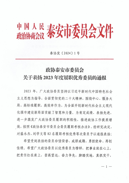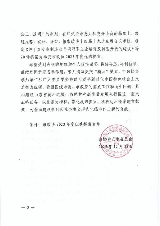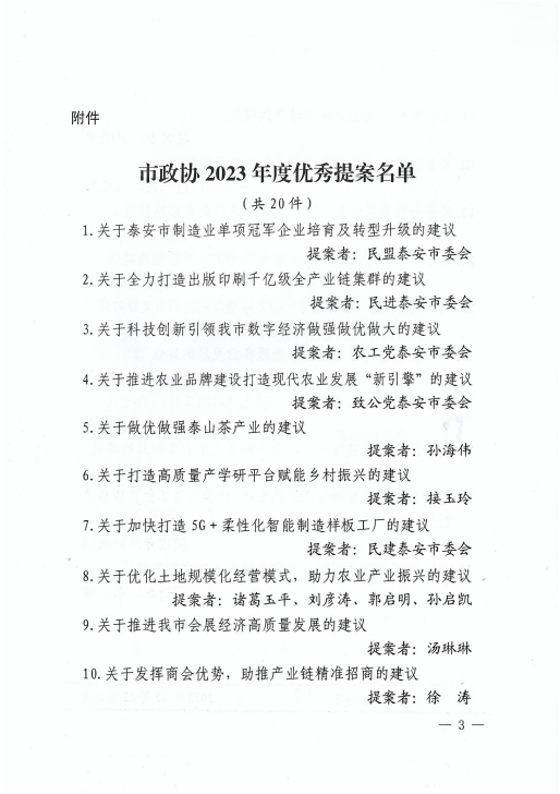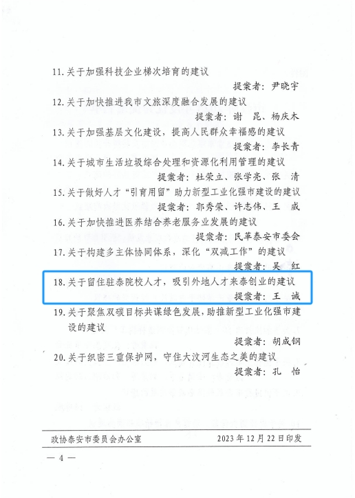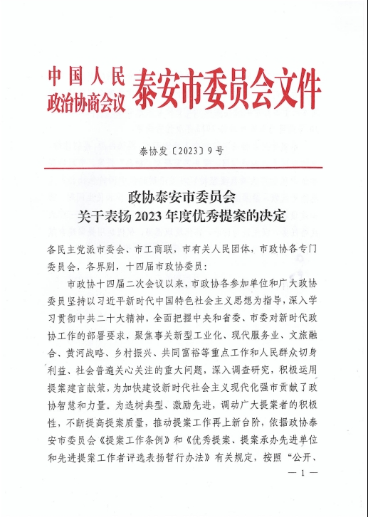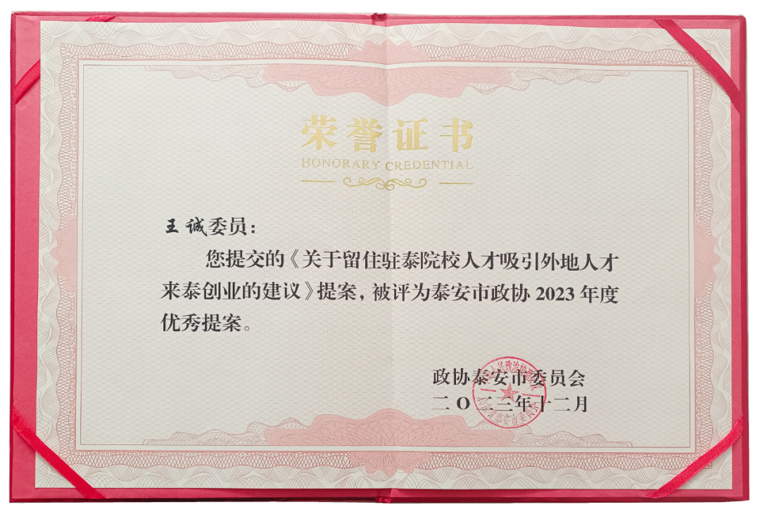 在會上,政協(xié)泰安市委員會發(fā)布了關(guān)于表揚2023年度優(yōu)秀提案的決定,王誠董事長《關(guān)于留住駐泰院校人才,吸引外地人才來泰創(chuàng)業(yè)的建議》被選為優(yōu)秀提案。