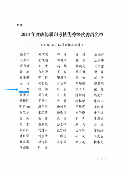 2023年,廣大政協(xié)委員堅持以習近平新時代中國特色社會主義思想為指導(dǎo),全面貫徹黨的二十大精神,圍繞中心、服務(wù)大局、高標準履職、高效率作為,為全面開創(chuàng)新時代社會主義現(xiàn)代化強市建設(shè)新局面貢獻了智慧和力量。為表揚先進,會上公布了2023年度政協(xié)履職考核優(yōu)秀等次委員名單,董事長王誠光榮上榜!