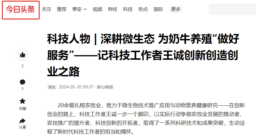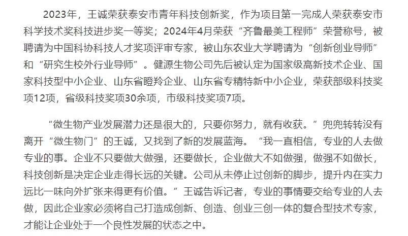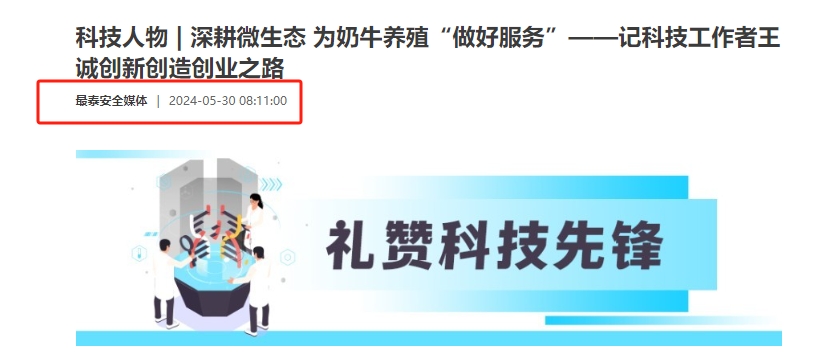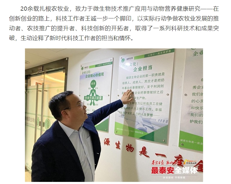 2024年5月30日迎來了第八個全國科技工作者日,山東健源生物科技有限公司董事長王誠作為泰安市科協推選的科技工作者代表接受了泰安日報記者的采訪。《深耕微生態,為奶牛養殖“做好服務”——記科技工作者王誠創新創造創業之路》報道在人民日報、人民號、今日頭條、泰山晚報、最泰安全媒體等多家新聞平臺發布。