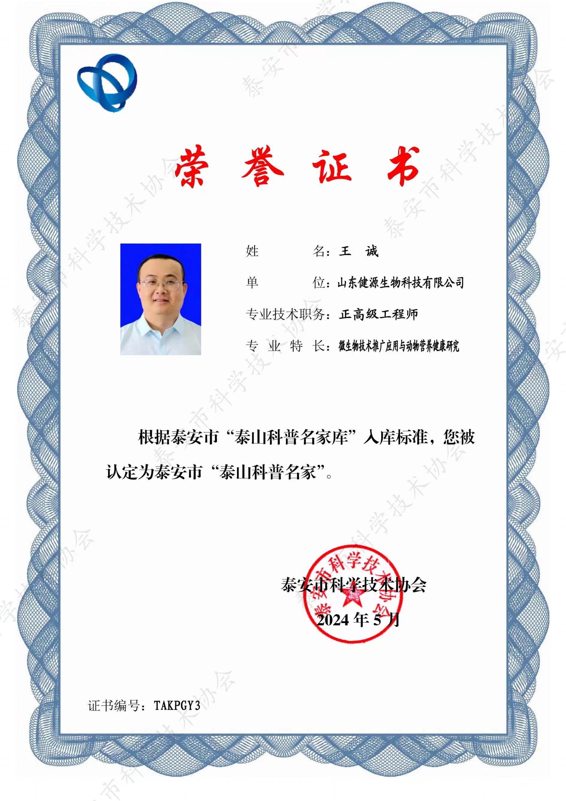 發布時間:[2024-6-6 16:33:30] 瀏覽量:2761次近日,泰安市科學技術協會公布了泰安市“泰山科普名家庫”入選專家名單,根據泰安市“泰山科普名家庫”入庫標準,山東健源生物科技有限公司董事長王誠被認定為泰安市“泰山科普名家”。
