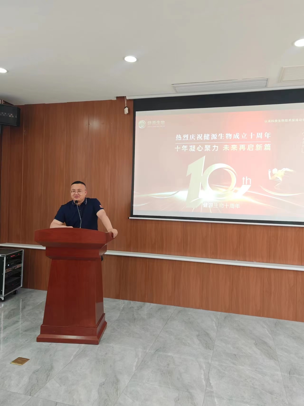王誠董事長在講話中指出,健源生物十年來,克服了無資金、無經驗、無市場的創業困難,走出了一條他無我有、他有我優、他優我新的創新發展之路,實現了從無到有、從小到大、從弱到強的飛速發展。這一切離不開全體員工的緊密追隨,離不開客戶朋友的支持信任,離不開各級領導的關懷幫扶。健源生物將始終不忘初心牢記使命,堅守“誠實守信”的企業核心價值觀,打造生物科技新質生產力,以高科技生物技術造福人類。