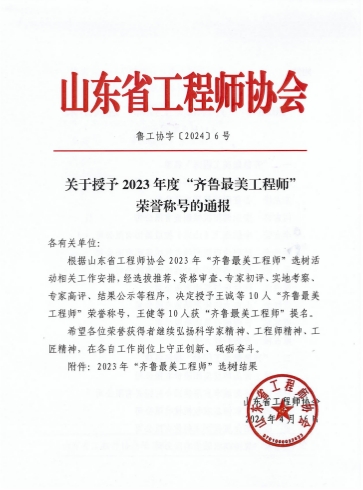 王誠(chéng)董事長(zhǎng)榮獲2023年度“齊魯最美工程師”榮譽(yù)稱(chēng)號(hào)