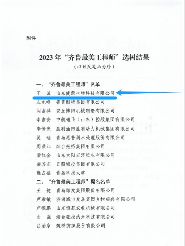 發(fā)布時(shí)間:[2024-7-5 15:51:56] 瀏覽量:3031次近日,山東省工程師協(xié)會(huì)下發(fā)關(guān)于授予2023年度“齊魯最美工程師”榮譽(yù)稱(chēng)號(hào)的通報(bào),山東健源生物科技有限公司董事長(zhǎng)王誠(chéng)被授予2023年度“齊魯最美工程師”榮譽(yù)稱(chēng)號(hào)。