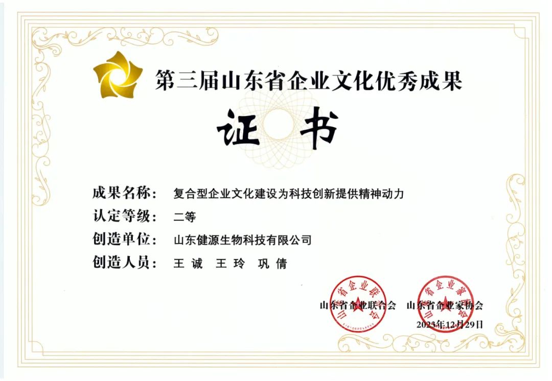 熱烈祝賀 山東健源生物科技有限公司 榮獲 第三屆山東省企業文化優秀成果 二等獎 1月23日-...