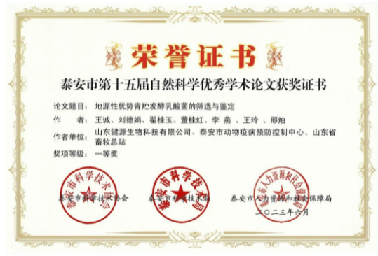 2023-7-6 山東健源生物榮獲泰安市第十五屆自然科學優秀學術論文一等獎