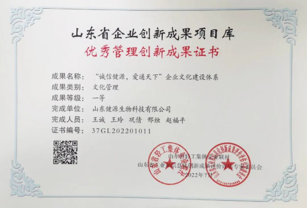 2022-7-22 山東健源生物榮獲山東省企業(yè)創(chuàng)新成果項(xiàng)目庫(kù)優(yōu)秀管理創(chuàng)新成果一等獎(jiǎng)