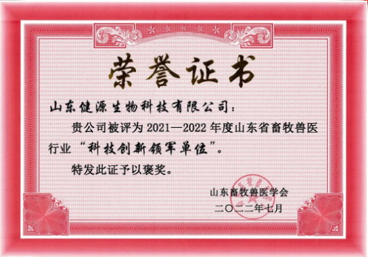 2022-8-1 祝賀山東健源生物被評(píng)為2021-2022年度山東省畜牧獸醫(yī)行業(yè)“科技創(chuàng)新領(lǐng)軍單位”