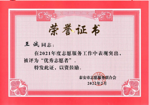 2022-3-4 熱烈祝賀山東健源生物王誠(chéng)董事長(zhǎng)榮獲2021年度“志愿者”榮譽(yù)稱號(hào)
