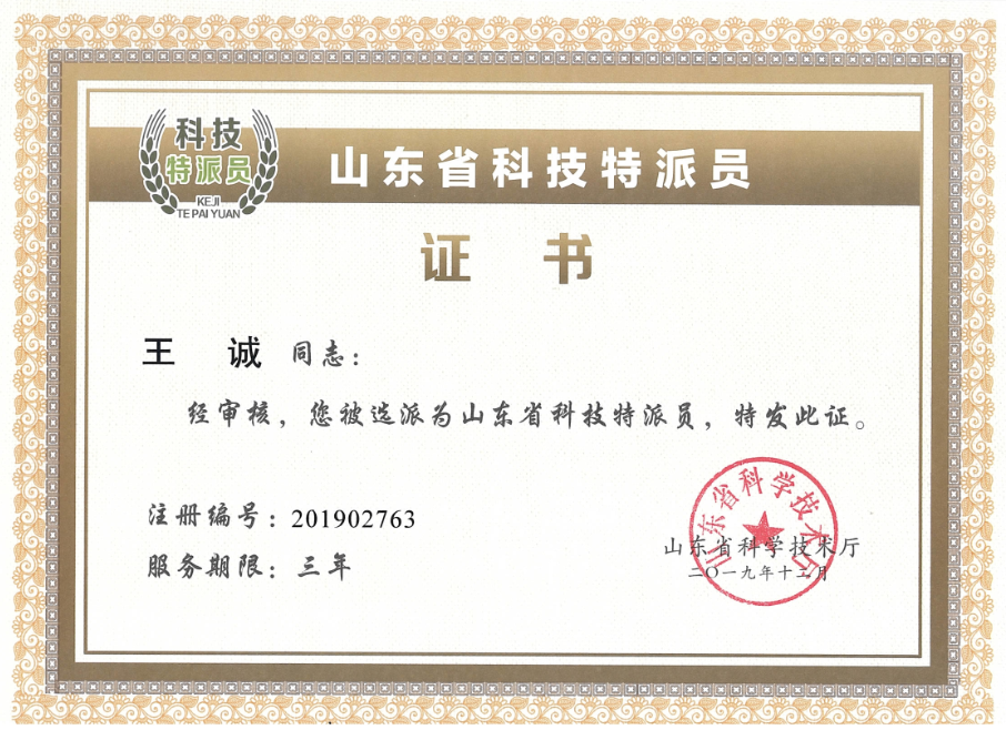 2020-6-22 祝賀山東健源生物科技有限公司董事長王誠先生被選任為山東省科技特派員