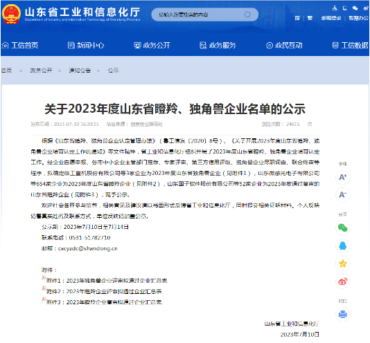 根據(jù)《山東省瞪羚、獨角獸企業(yè)認(rèn)定管理辦法》(魯工信發(fā)〔2020〕8號)、《關(guān)于開展2023年度山東省瞪羚、獨角獸企業(yè)培育認(rèn)定工作的通知》等文件精神,山東省工業(yè)和信息化廳組織開展了2023年度山東省瞪羚、獨角獸企業(yè)培育認(rèn)定工作。經(jīng)企業(yè)自愿申報、各市中小企業(yè)主管部門推薦、專家評審、第三方信用評級、獨角獸企業(yè)盡職調(diào)查、聯(lián)合終審等程序,確定654家企業(yè)為2023年度山東省瞪羚企業(yè),山東健源生物科技有限公司被認(rèn)定為2023年度山東省瞪羚企業(yè)。
