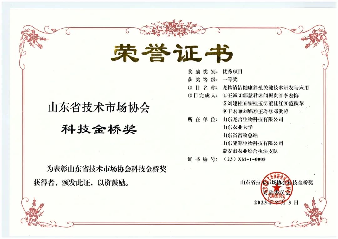 9月14日,2023年度山東省科技金橋獎(jiǎng)表彰獎(jiǎng)勵(lì)大會(huì)暨科技引領(lǐng)高質(zhì)量發(fā)展會(huì)議在濟(jì)寧任城區(qū)召開(kāi)。山東健源生物有限公司與其下屬山東寵言生物科技有限公司共同完成的“寵物清潔健康養(yǎng)殖關(guān)鍵技術(shù)研發(fā)與應(yīng)用”項(xiàng)目,經(jīng)過(guò)專業(yè)組評(píng)審、評(píng)審委員會(huì)評(píng)審、獎(jiǎng)勵(lì)委員會(huì)終審,最終榮獲山東省技術(shù)市場(chǎng)協(xié)會(huì)科技金橋獎(jiǎng)優(yōu)秀項(xiàng)目一等獎(jiǎng)。