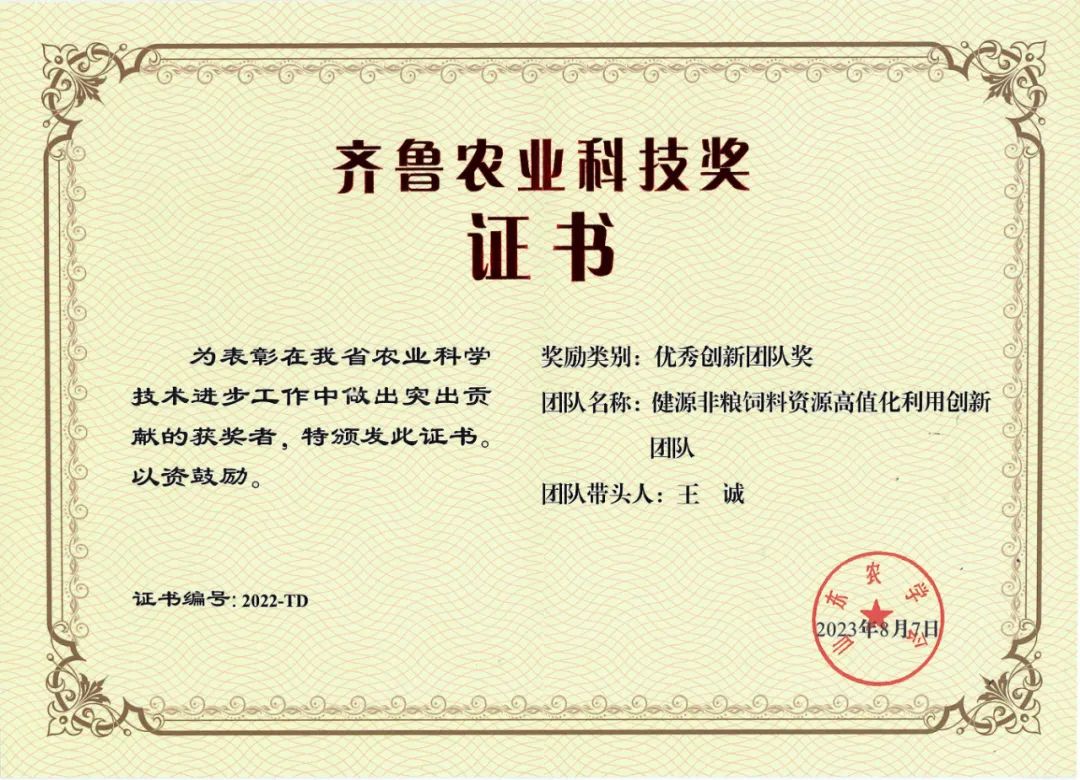 由山東健源生物有限公司董事長(zhǎng)王誠(chéng)作為團(tuán)隊(duì)帶頭人,帶隊(duì)的“健源非糧飼料資源高值化利用創(chuàng)新團(tuán)隊(duì)”榮獲2022年度齊魯農(nóng)業(yè)科技獎(jiǎng)優(yōu)秀創(chuàng)新團(tuán)隊(duì)獎(jiǎng)。