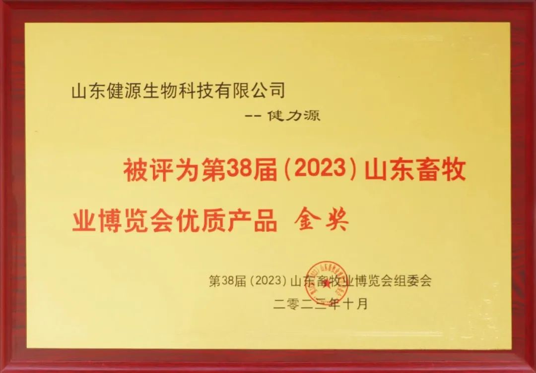 山東健源生物產品“健力源”獲得第38屆山東畜牧業博覽會優質產品金獎